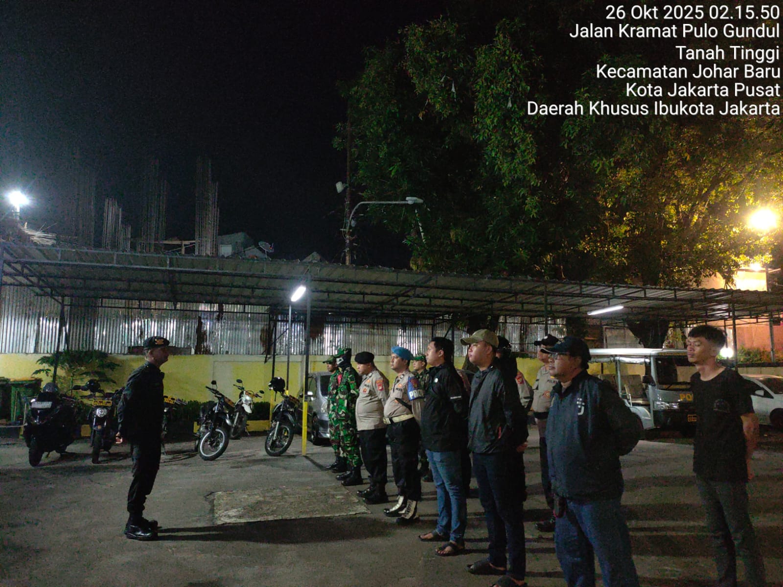 Jakarta Pusat, Detik kriminal – Dalam rangka menjaga situasi keamanan dan ketertiban masyarakat, Polsek Johar Baru bersama unsur Tiga Pilar melaksanakan kegiatan Apel Patroli Cipta Kondisi Antisipasi Guantibmas, Tawuran Warga, “3 Cepu”, dan Kejahatan Jalanan, pada Minggu (26/10/2025) pukul 02.16 WIB di depan halaman Mapolsek Johar Baru, Kelurahan Tanah Tinggi, Kecamatan Johar Baru, Jakarta Pusat.