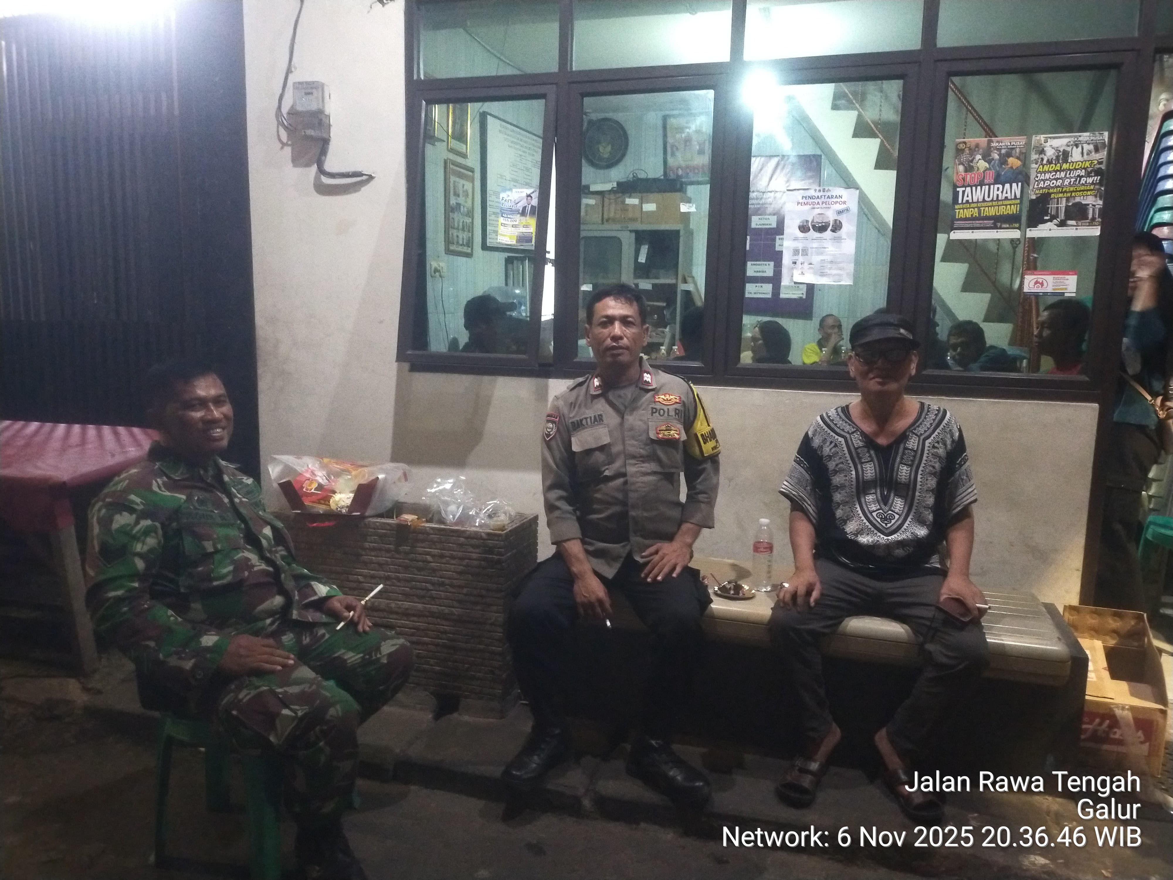 Jakarta Pusat – Dalam rangka memperkuat keamanan lingkungan dan membangun sinergi dengan warga, Bhabinkamtibmas Kelurahan Galur, Aiptu Baktiar, bersama Bhabinsa Galur Serka Agus, melaksanakan kegiatan Sambang Pos Kamling RW 06 di depan Balai Warga RW 06, Jalan Rawa Tengah, Kelurahan Galur, Johar Baru, Jakarta Pusat, pada Kamis malam (6/11/2025) pukul 21.00 WIB.