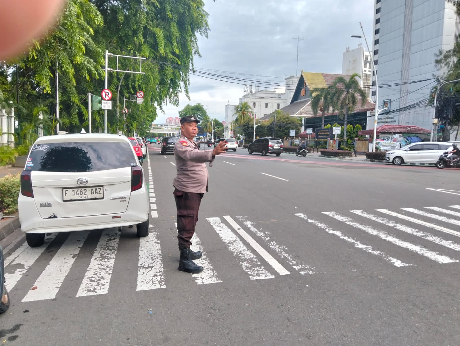 Dengan peluit dan isyarat tangan yang tegas namun ramah, petugas memastikan tidak ada kendaraan yang berhenti sembarangan atau melawan arus. Sesekali, mereka membantu pejalan kaki menyeberang dengan aman di tengah ramainya kendaraan. Kehadiran polisi di lokasi pun membuat suasana terasa lebih tertib dan nyaman.