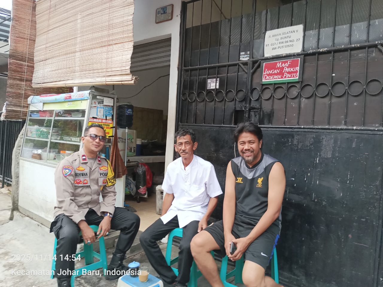 Jakarta Pusat – Bhabinkamtibmas Kelurahan Kampung Rawa, Aipda Ikhwan, melaksanakan patroli cooling system dan sambang door to door di RT 17 RW 04, Jl. Rawa Selatan Gang Buntu, Sabtu (15/11/2025) pukul 14.50 WIB. Kegiatan ini melibatkan komunikasi sosial dengan Ketua RT 17, Pak Agus, dan warga setempat, dengan tujuan memberikan pesan kamtibmas serta kewaspadaan terhadap curanmor.