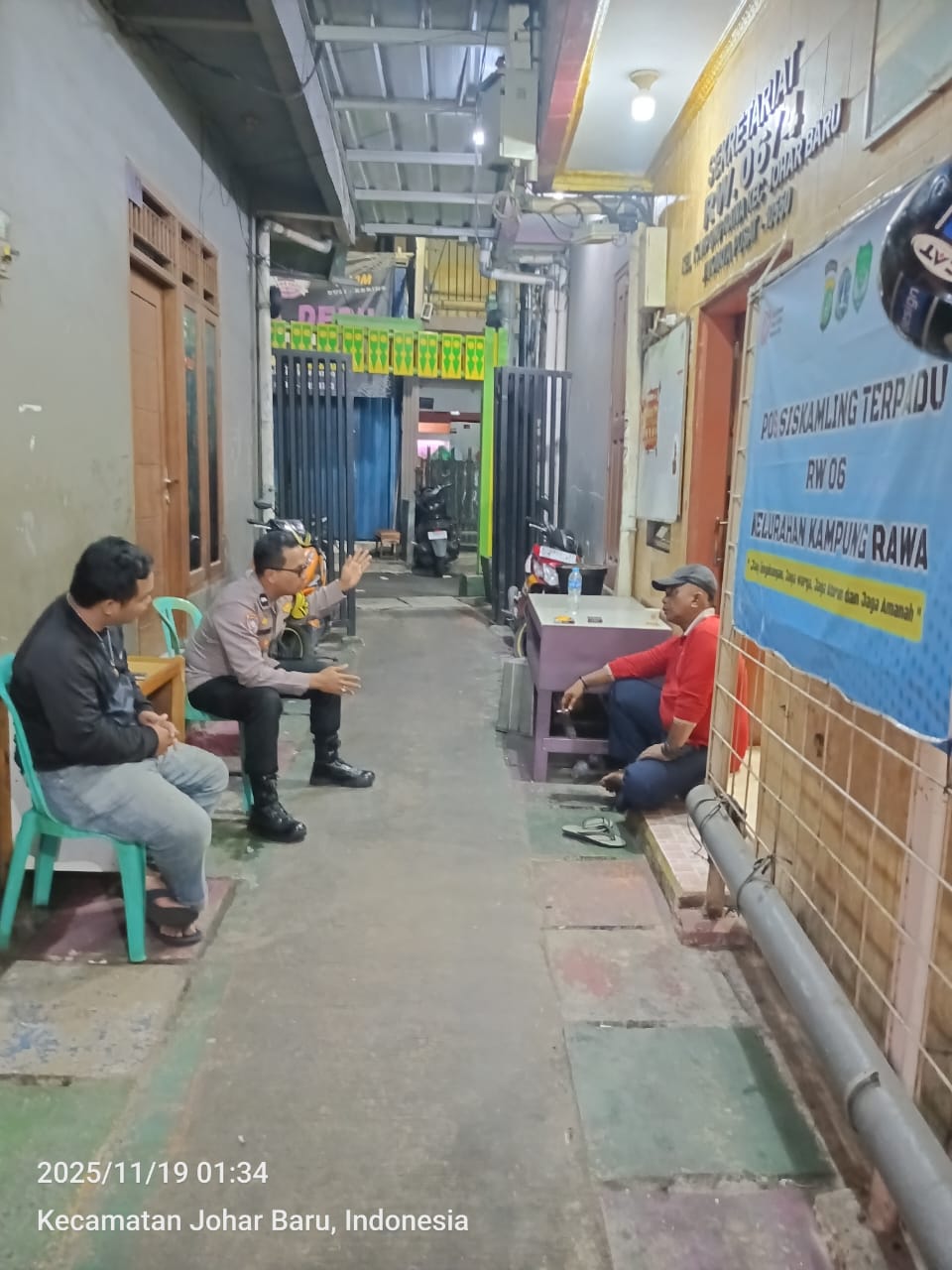 Jakarta Pusat – Bhabinkamtibmas Kelurahan Kampung Rawa, Aipda Ikhwan, melaksanakan patroli jalan kaki dan kunjungan ke Pos Satkamling RW 06, Jl. Rawa Sawah 2 RT 04 RW 06, Rabu (19/11/2025) pukul 01.35 WIB.
