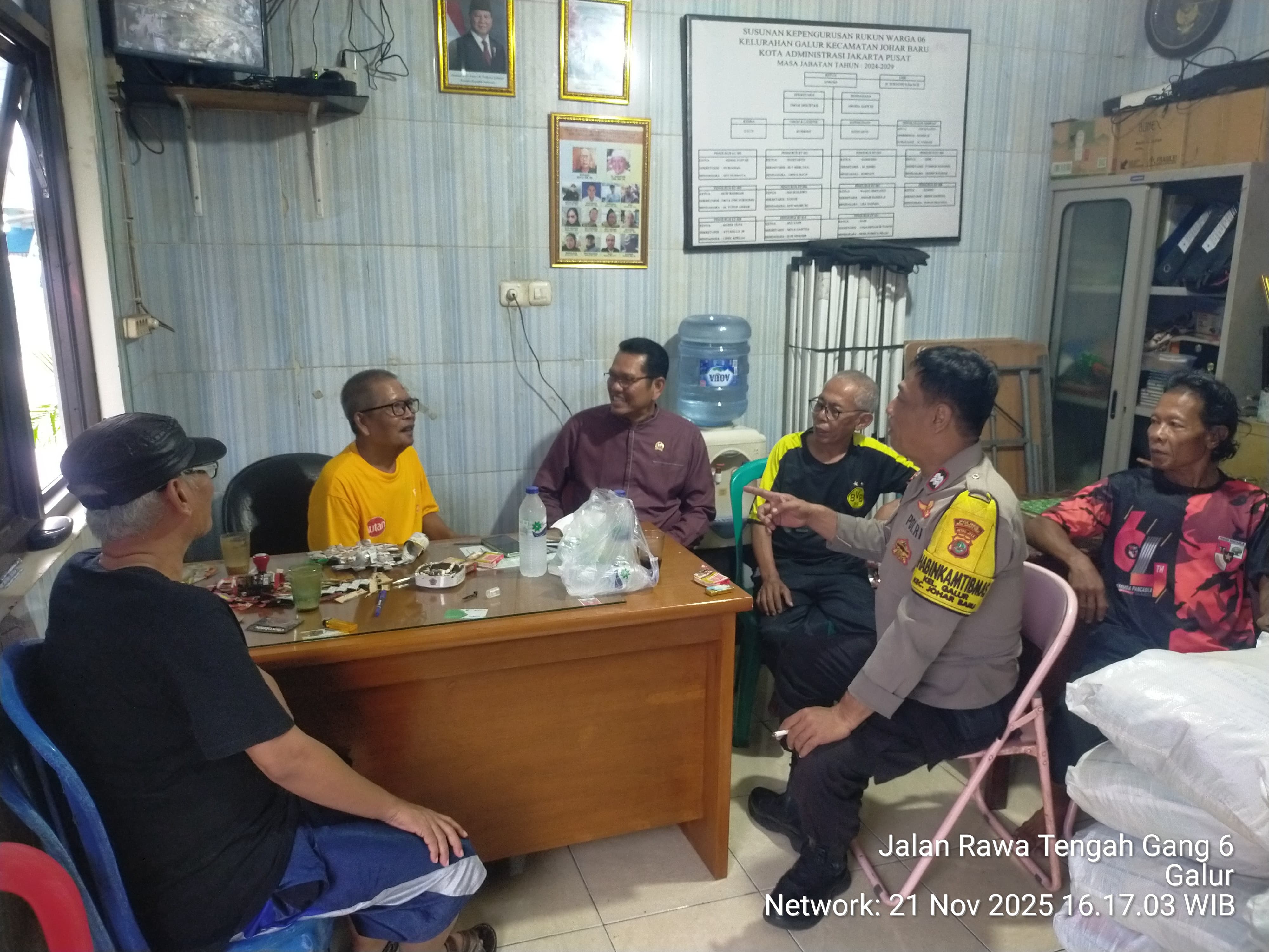 Jakarta Pusat — Upaya menjaga keamanan wilayah dan membangun komunikasi aktif dengan masyarakat terus dilakukan Polsek Johar Baru. Pada Kamis malam (20/11/2025) pukul 23.00 WIB, Bhabinkamtibmas Kelurahan Galur, Aiptu Baktiar, melaksanakan kegiatan sambang dan cooling system di Balai Warga RW 06, Jl. Rawa Tengah, Kel. Galur, Johar Baru.