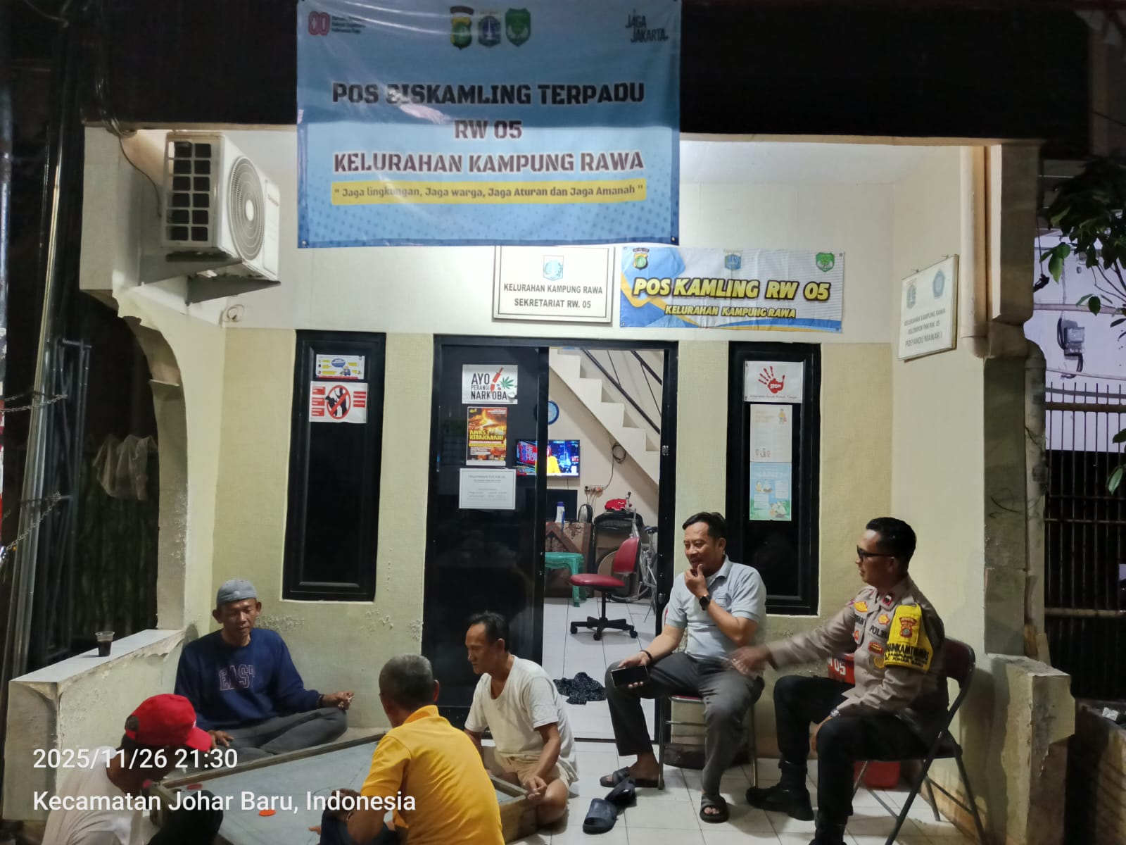 Jakarta Pusat – Bhabinkamtibmas Kelurahan Kampung Rawa, Aipda Ikhwan, melaksanakan patroli wilayah dan sambang ke Pos Satkamling RW05, Jl. Rawa Selatan 2 RT14 RW05, Rabu (26/11/2025) pukul 21.30 WIB.
