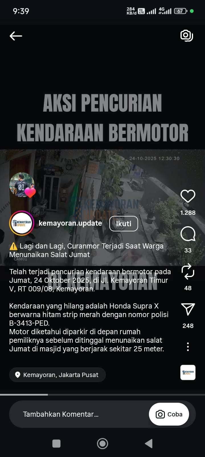 Kasus ini berawal dari laporan korban RA (22) yang kehilangan sepeda motor Honda B-3413-PED di Jalan Kemayoran Timur II, Jumat 24 Oktober 2025 lalu. Rekaman CCTV yang memperlihatkan wajah para pelaku kemudian menyebar luas dan menjadi petunjuk penting dalam proses penyelidikan.