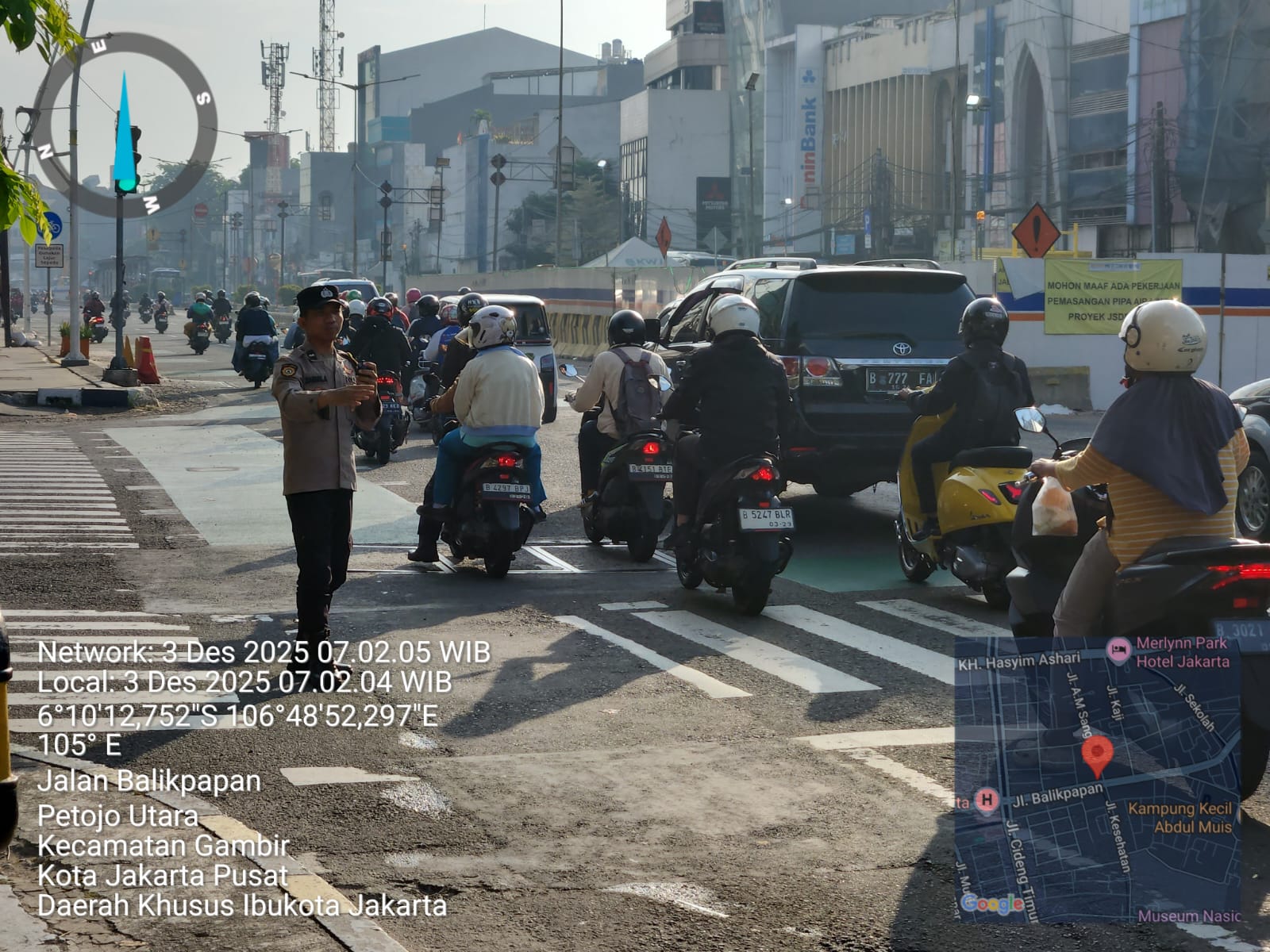 Jakarta Pusat – Kepadatan arus kendaraan pada pagi hari di kawasan Jl. Suryopranoto, kerap mengalami peningkatan yang signifikan seiring dengan jam berangkat kerja masyarakat. Untuk menjaga situasi tetap aman dan tertib, Petugas Polsek Metro Gambir melaksanakan kegiatan pengaturan lalu lintas di sekitar Traffic Light (TL) Kesehatan, Rabu (2/12/2025) Pukul 07.00 Wib.