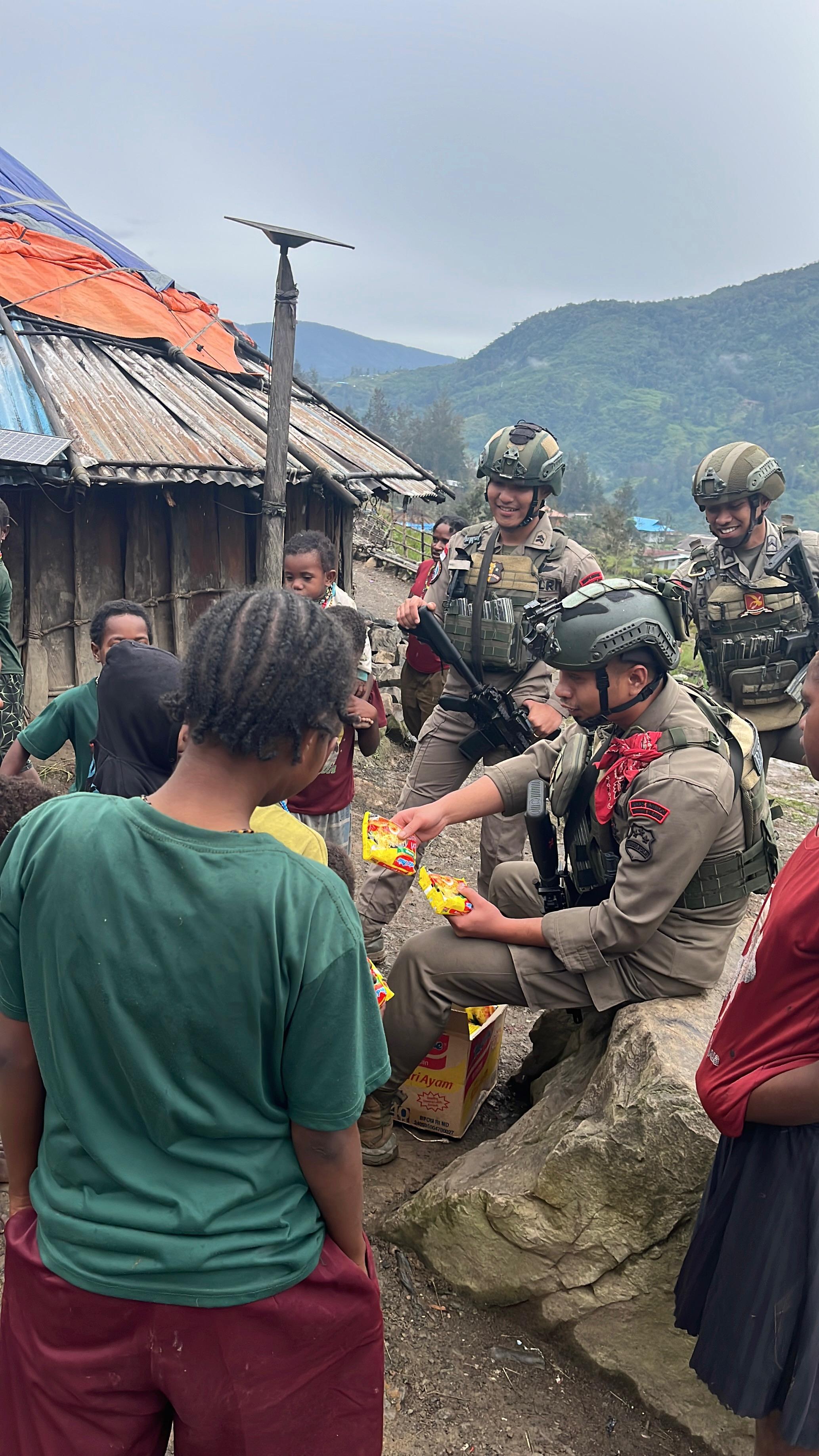Sinak, Puncak — Personel Sektor Sinak Operasi Damai Cartenz di sela tugasnya melaksanakan pemberian mi instan dan makanan ringan kepada masyarakat yang tengah melaksanakan kegiatan membersihkan Gereja Gingga Baru Klasik Sinak, Sabtu (6/12).