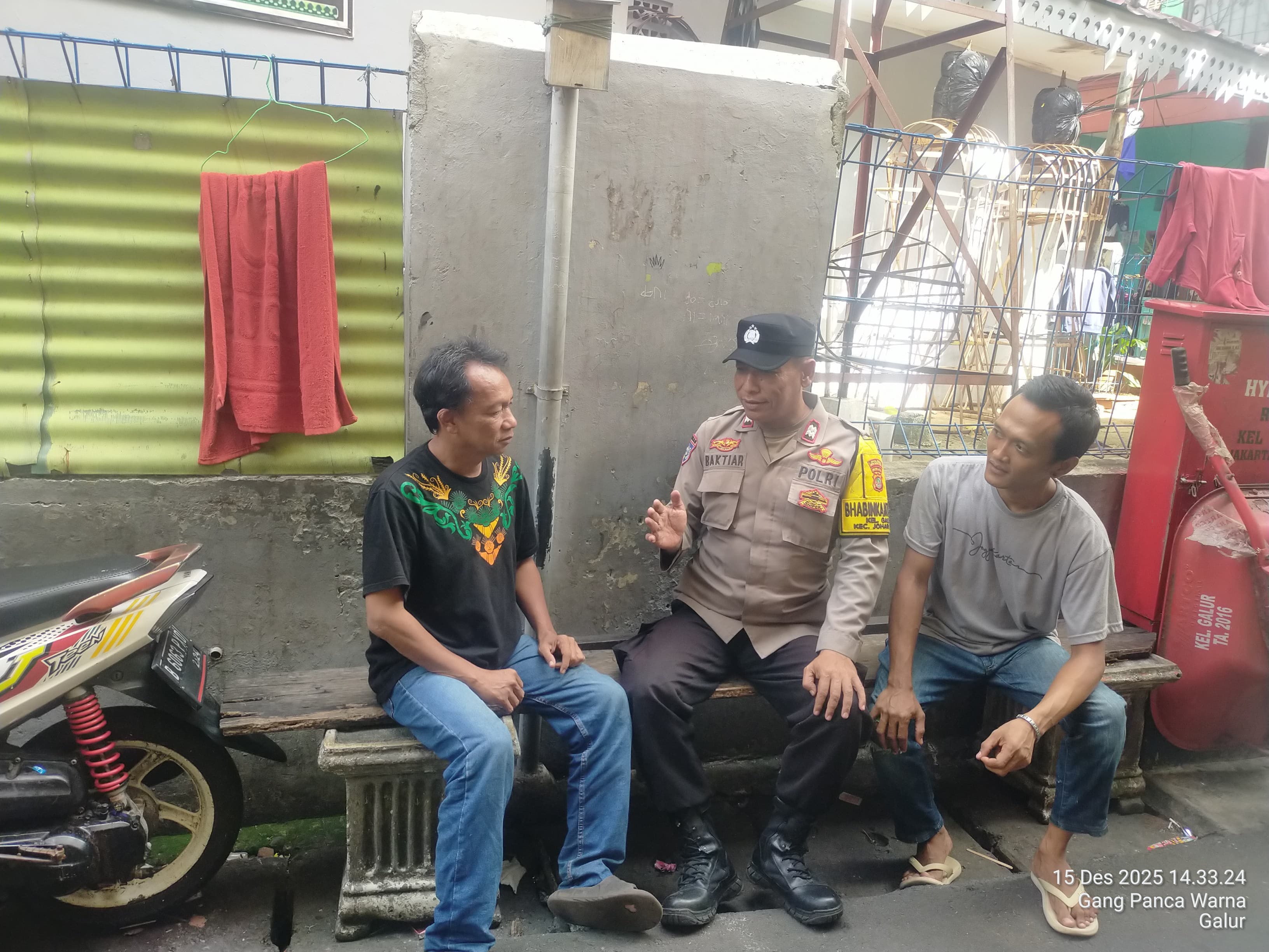 Jakarta Pusat — Upaya menjaga keamanan dan ketertiban masyarakat (kamtibmas) terus diperkuat jajaran Polres Metro Jakarta Pusat melalui kegiatan sambang warga dan pendekatan dialogis. Pada Senin (15/12/2025) pukul 14.30 WIB, Bhabinkamtibmas Kelurahan Galur, Aiptu Baktiar, melaksanakan sambang dan cooling system di Jl. Galur Selatan RT 012 RW 01, Kelurahan Galur, Kecamatan Johar Baru.