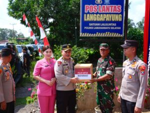 Selain melakukan pengecekan kesiapan personel dan kelengkapan pos, Kapolres dan rombongan juga menyerahkan paket bingkisan sebagai bentuk apresiasi dan dukungan moril kepada petugas yang berjaga selama Operasi Lilin Toba 2025.