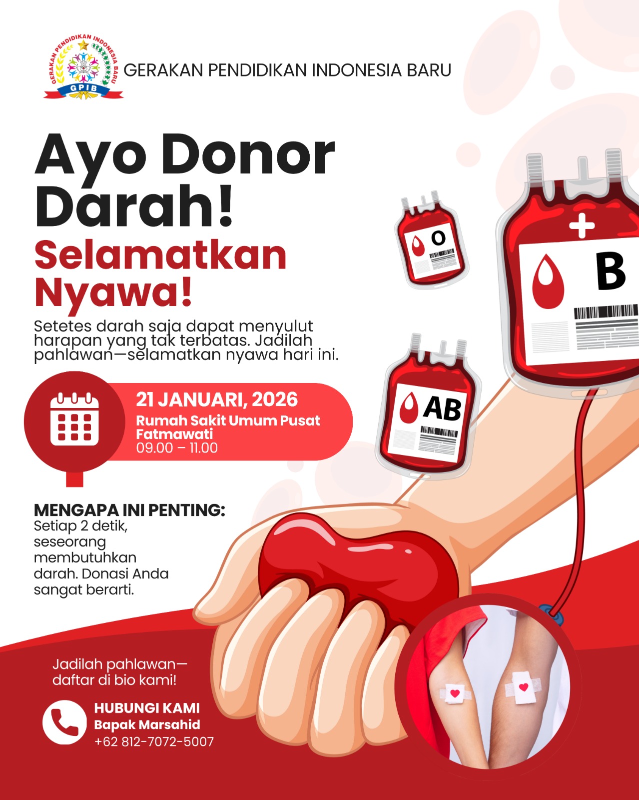 Jakarta Selatan – Gerakan Pendidikan Indonesia Baru (GPIB) menggelar kegiatan donor darah bertajuk “Setetes Darah Sangat Berarti Bagi yang Membutuhkan”. Kegiatan yang memiliki manfaat kesehatan dan nilai kepedulian sosial ini akan diselenggarakan pada hari Rabu, 21 Januari 2026.