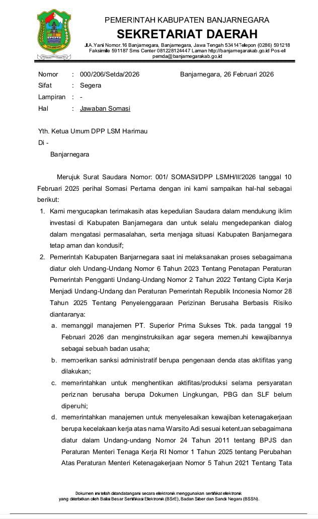 Keputusan tegas ini tertuang dalam surat jawaban somasi dari Sekretariat Daerah Kabupaten Banjarnegara nomor 000/206/Setda/2026 tertanggal 26 Februari 2026. Surat tersebut merupakan respons langsung atas rangkaian aksi massa dan somasi hukum yang dilayangkan oleh DPP LSM Harimau.